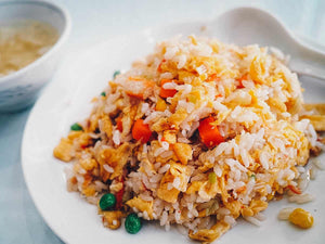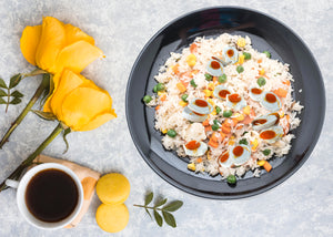Hainanese chicken rice is a dish that consists of succulent steamed white chicken cut into bite-size pieces and served on fragrant rice with some light soy sauce. The dish is topped with sprigs of coriander leaf and sesame oil, and accompanied by a garlic-chilli dip.